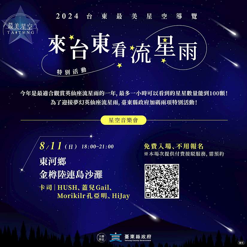 台東縣政府將於8月11日在金樽陸連島沙灘舉辦東河場「最美星空音樂會」,8月11、12日適逢英仙座流星雨極大期,將是今年唯一流星雨下的音樂會;另縣府於8月11日在臺東加路蘭遊憩區、12日於成功三仙台加開星空導覽場次,讓更多人在星空導遊帶領下體驗流星雨的魅力,台東縣長饒慶鈴歡迎全國好朋友來台東旅遊,白天賞熱氣球,晚上則一起聽浪、數星星。