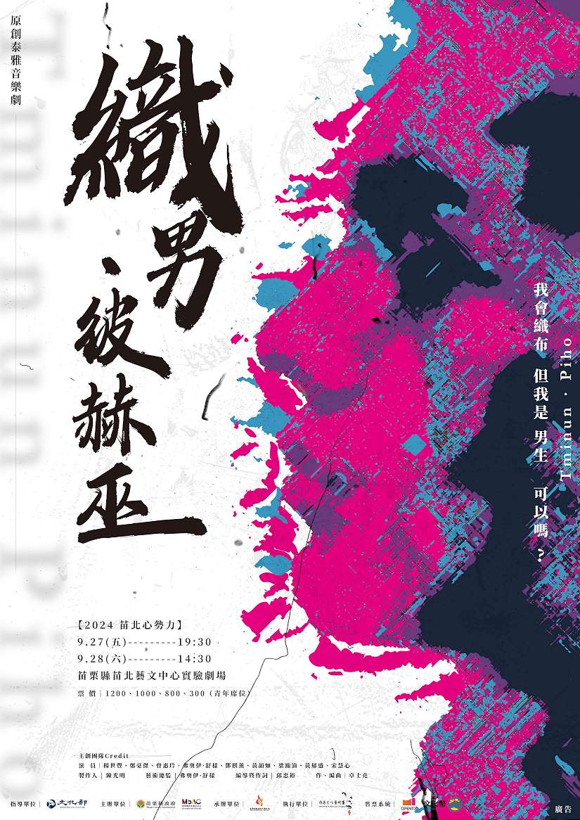 苗栗縣政府文化觀光局辦理113年度苗栗縣扶植傑出演藝團隊計畫,期盼提升本縣傑出演藝團隊能見度,拓展苗栗縣藝文地圖。今年,傳源文化藝術團首次跨界攜手專業音樂劇人才,打造全新原創泰雅音樂劇《織男・彼赫巫》,並與苗北藝文中心合作辦理,將於9月27日(五)晚上7點30分和9月28日(六)下午2點30分在苗北藝文中心實驗劇場演出,採售票入場,請至Opentix售票系統購票。