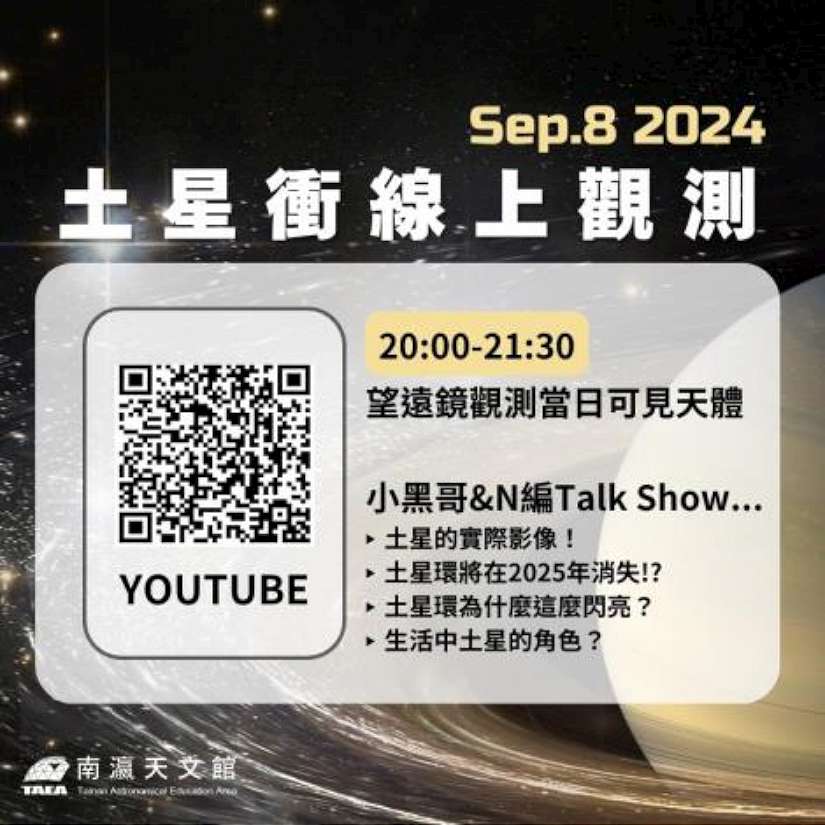 土星環即將消失!?南瀛天文館表示,隨著9月的到來,一系列令人振奮的天文現象也即將到來,天文愛好者們別錯過!包含9月8日的土星衝、土星合月、水星西大距、海王星衝,當日晚上將舉辦線上直播;去年發現的重磅彗星C/2023 A3 (Tsuchinshan-ATLAS)也將抵達近日點,南瀛天文館將在9月28至29日辦理「2024秋夜追星Party」,直接帶大家到左鎮二寮追彗星看日出。