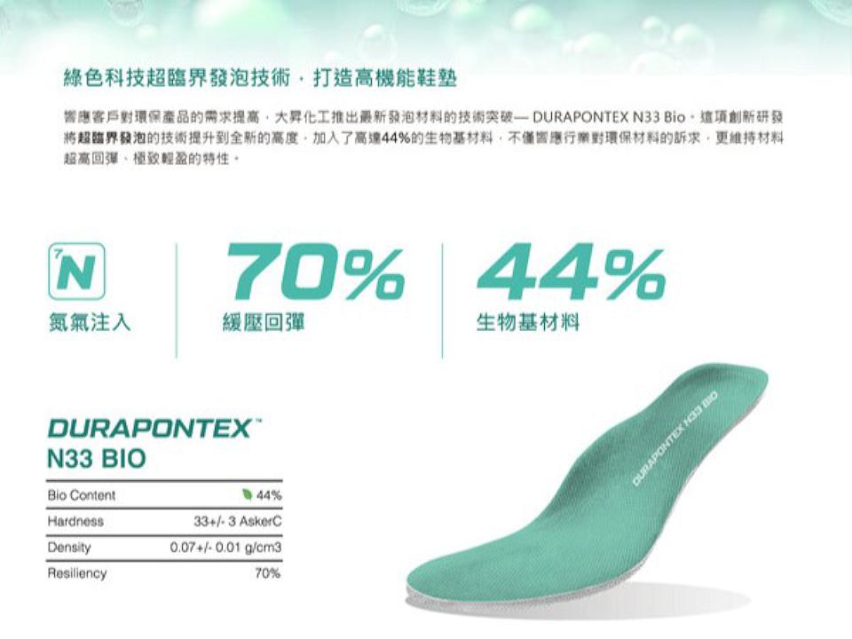 【美通社/俄勒岡州報導】領先全球的高性能泡棉製造商 大昇化工在美國的鞋材工業博覽會 NE Material Show 及 NW Material Show 上推出革命性環保創新產品 DURAPONTEX ™ N33 Bio。DURAPONTEX N33 Bio 在製作過程中加入了生物基材料,這項研發為超臨界發泡的卓越性能產品多了一項低碳材料的選擇。