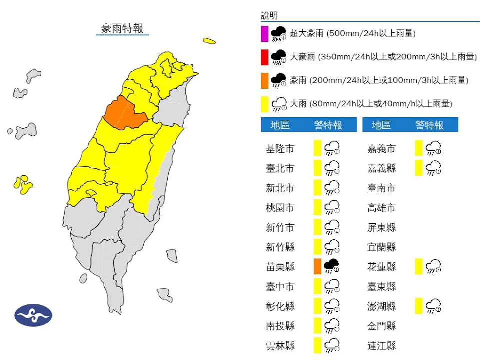 根據中央氣象局預測,24日受到鋒面通過影響,全台天氣不穩定,各地易有短暫陣雨或雷雨,且西半部地區及宜蘭、花蓮易有局部大雨發生,苗栗縣有局部大雨或豪雨,這波鋒面了除了短延時強降雨,也可能伴隨雷擊及強陣風,民眾非必要請勿前往山區活動,同時行車用路請留意低能見度。