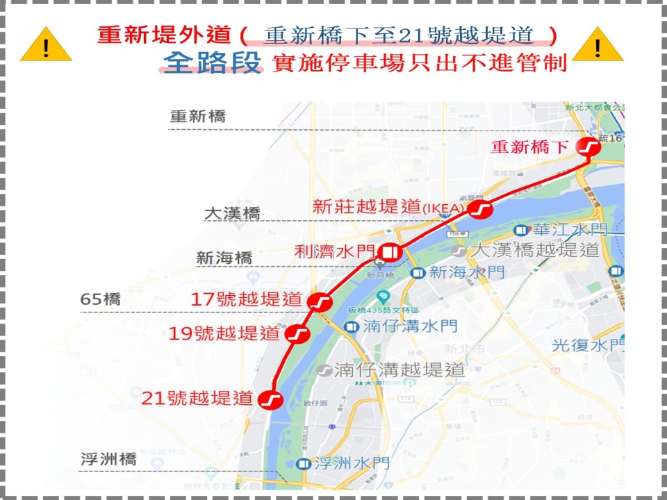 小犬颱風來襲,新北市大漢溪左岸重新橋下至21號越堤道間之停車場及路邊停車格,4日上午8時起只出不進,因此上午7時起開放大漢溪左岸水門周邊部分道路紅黃線停車,路邊停車格也暫停收費。