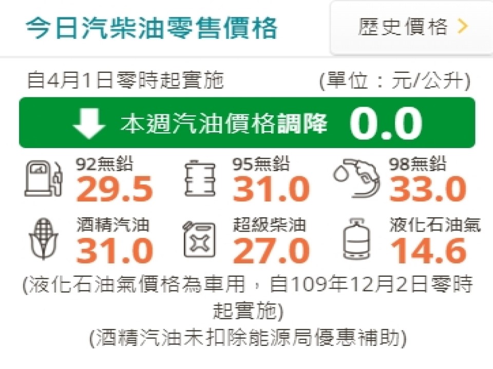 國際油價震盪微跌,台灣中油公司自明天(1日)凌晨0時起汽、柴油價格皆不予調整,參考零售價格分別為92無鉛汽油每公升29.5元、95無鉛汽油每公升31元、98無鉛汽油每公升33元、超級柴油每公升27元。