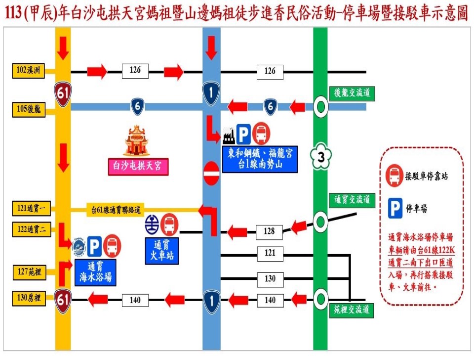 苗栗縣白沙屯拱天宮媽祖甲辰年徒步進香進香報名人數已經超過17萬人,通霄警分局為能有效疏解活動期間人、車潮壅塞問題,避免屆時湧進大量人車,造成交通堵塞,將於3月17、18日登轎日至及25、26日回鑾日期間,於白沙屯、通霄苑裡地區實施交通管制,並協請白沙屯拱天宮配合執行相關勤務等疏導交通創新精進作為,除了維護民眾安全、防搶、防竊外也執行交通疏導事項。