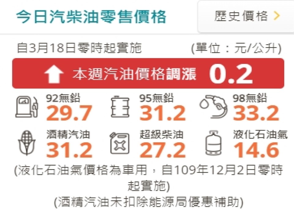 台灣中油公司自18日凌晨零時起汽、柴油價格各調漲0.2元及0.1元,參考零售價格分別為92無鉛汽油每公升29.7元、95無鉛汽油每公升31.2元、98無鉛汽油每公升33.2元、超級柴油每公升27.2元,所以要加油的民眾動作要快。
