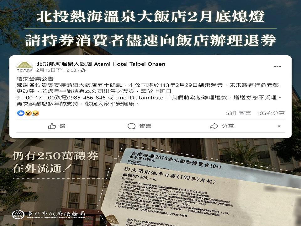 台北市北投「熱海大飯店」官網公告將於2月29日結束營業,台北市法務局20日發布消費警訊,經北市府法務局消保官、衛生局、觀光傳播局派員到場瞭解,仍有計約250萬元之餐券、溫泉券及休息券在外流通尚未兌領,消保官呼籲手上持有禮券之消費者,於2月29日前,儘速攜帶禮券向飯店辦理退券退款。