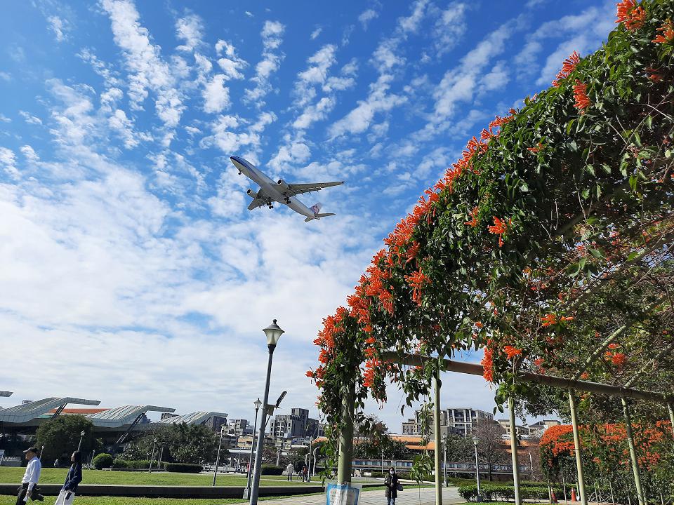 有「黃金珊瑚」美譽的炮杖花,春暖花開爭先綻放,橘色花瀑目前現身在花博圓山園區的角落,吸引路過民眾駐足欣賞。當飛機穿越天際線,在藍天、白雲襯托下,大家都化身為攝影高手,紛紛捕捉這難得的畫面,最棒的是這裡是少數不用人擠人,只要搭乘捷運就可以輕鬆抵達的賞花秘境。