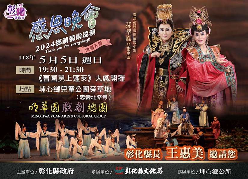 時序即將進入溫馨5月,在這個充滿愛與幸福的季節,彰化縣政府特別規劃了3場精彩歌仔大戲,邀請全國知名的優質演出團隊到彰化戶外公演,從5月3日起至5月5日連續3日歌仔大戲登場,均免票入場,精美絕倫的服裝與舞台特效,讓人大開眼界,感受到傳統戲曲的優美唱腔及感性的肢體語言。彰化縣長王惠美歡迎全國鄉親一起來彰化看戲,用心看戲、用耳聽戲,品味彰化今昔一氣的藝文之風。