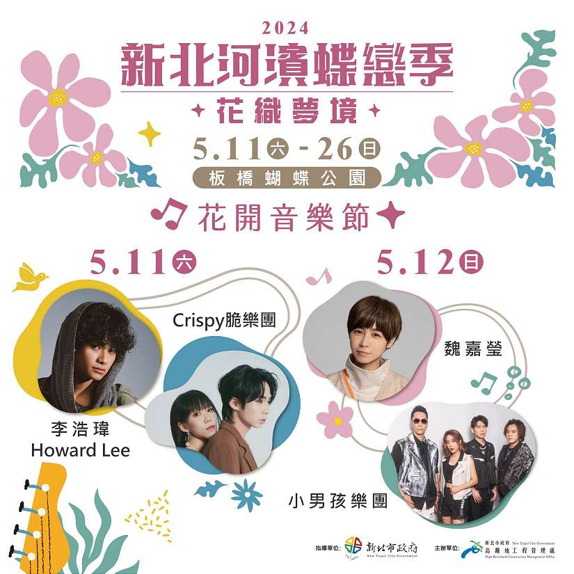 新北市政府高灘地工程管理處每年初夏在板橋蝴蝶公園舉行的「新北河濱蝶戀季」,今年即將於5月11日熱鬧登場,展覽至5月26日。開展週的六、日邀請年輕人最愛的歌手團體獻唱,還有好日市集、萬盆花海及文青裝置藝術、限定好禮等系列活動,歡迎民眾一同來聽音樂、逛市集、賞花海。