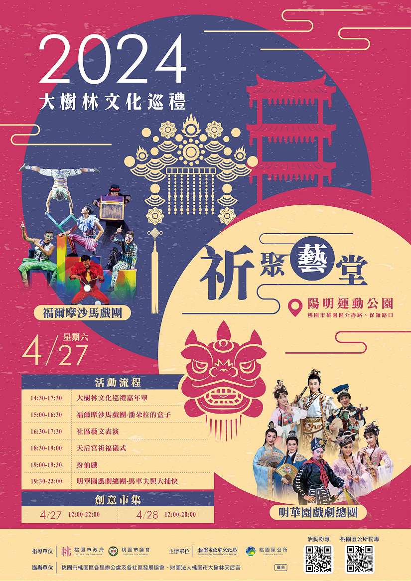 由桃園區公所舉辦之「2024大樹林文化巡禮」活動,於本週六、日在桃園區三民路、介壽路口的陽明公園內舉辦,有好玩的手作DIY課程、精彩的FOCA福爾摩沙馬戲團《潘朵拉的盒子》、活力健康在地社團藝文表演、以及大樹林趣味問答送好禮、明華園戲劇團演出等精彩活動!