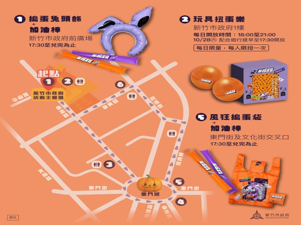 另外10月25日至31日市府1樓舉辦「玩具城展覽」,市府大廳、走廊將有裝置藝術及趣味打卡牆,並有小朋友喜愛的扭蛋機,每日晚上6點至9點都可以抽驚喜扭蛋,讓搗蛋兔陪伴大家歡度精采創意的萬聖節。(記者陳品綸/新竹報導)