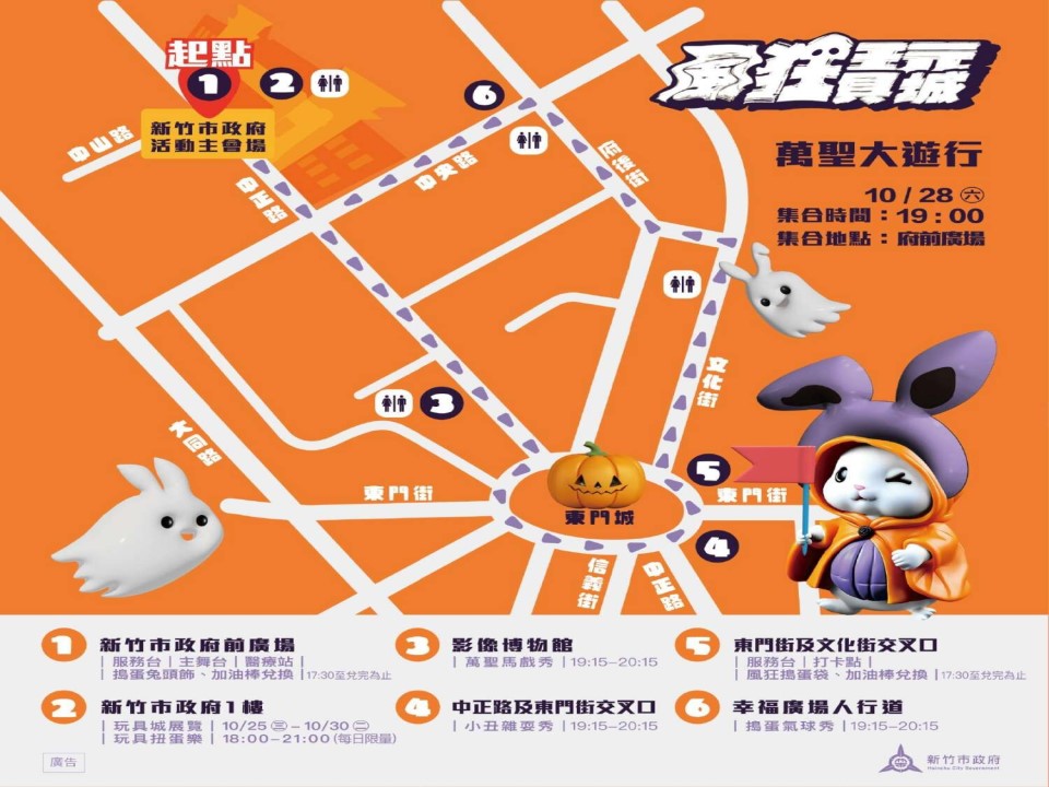市長高虹安表示,「新竹市萬聖節活動重磅登場!」大家換上可愛的南瓜裝兔子裝、怪奇的小丑妝、帥氣的蝙蝠俠或是美艷的女巫裝扮等,10月28日(六)晚上7點來市府前廣場參與「萬聖大遊行」,沿路中將有三處的街頭藝人為大家帶來驚喜,包含特技馬戲、趣味雜耍及造型氣球秀,幸運的小朋友還可以得到可愛的動物氣球。