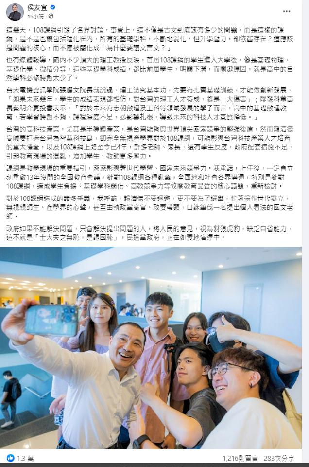 侯友宜臉書9日發文:「這幾天,108課綱引發了各界討論,事實上,這不僅是古文到底該有多少的問題,而是這樣的課綱,是不是也讓包括理化在內,所有的基礎學科,不斷地弱化、但升學壓力,卻依舊存在?這應該是問題的核心,而不應被簡化成『為什麼要讀文言文?』也有媒體報導,國內不少頂大的理工教授反映,首屆108課綱的學生進入大學後,像是基礎物理、基礎化學、微積分等,這些基礎學科成績,都比前屆學生,明顯下滑,而關鍵原因,就是高中的自然學科必修時數太少了。」..........