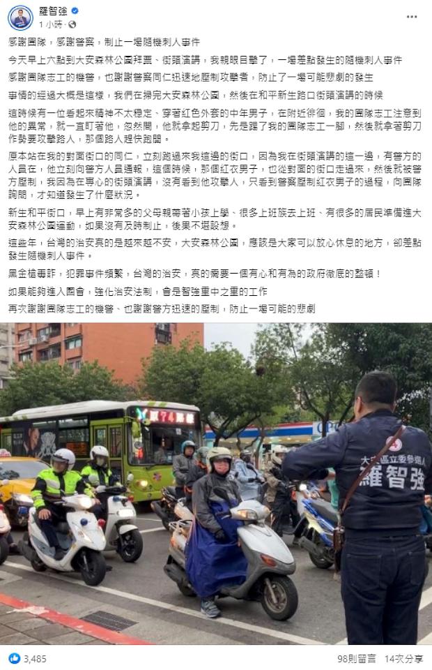 國民黨立委參選人羅智強臉書,21日貼文指出目擊一起男子持剪刀差點隨機次人事件,當時他與團隊志工剛在大安森林公園拜票完成,在新南路、和平東路口演講時,1名穿著紅衣男子疑似精神狀態不佳,在路口另一側徘迴,引起團隊志工的注意,沒想到男子突然拿出預藏的剪刀,先喘了志工一腳後,又作勢攻擊其他路人,還好沒有人受傷,隨後志工就跑來想維安的警力通報。