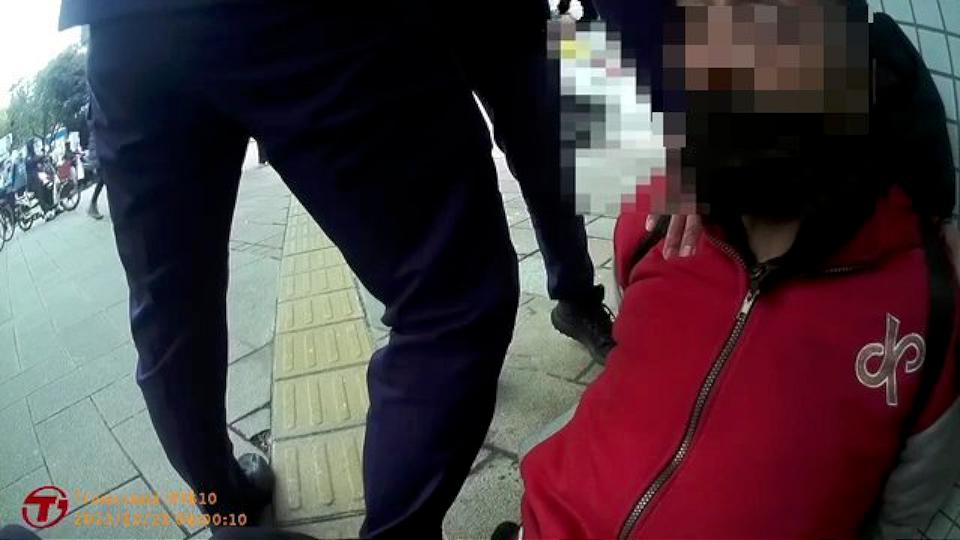 紅衣男子持剪刀在街頭隨機攻擊路人,隨後遭警方壓制逮捕。讀者提供