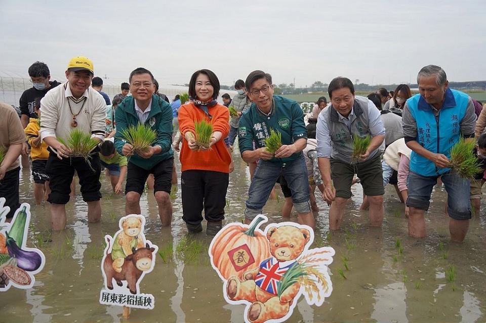 【記者戴英薇/長治報導】屏東熱博彩稻插秧活動暨屏東飯湯節,今23日上午在屏東農業物產館熱鬧登場,縣長周春米揭曉今年彩繪稻田主題,就是深受大小朋友喜愛的可愛經典泰迪熊,並帶領現場來賓及遊客下田一起體驗插秧,為2024屏東熱帶農業博覽會暖身,現場免費發放的上千份特色飯湯暖心又暖胃,周縣長表示,2024屏東熱帶農業博覽會將於2月3日至3月3日舉辦,歡迎全國民眾一起來參加。
