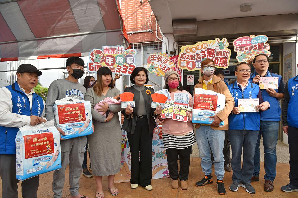 雲林縣政府為催生增產,「雲林萬寶龍」計畫 113年1月1日已正式上路,西螺戶政事務所日前受理今年第1、第2位生第4胎新生兒的出生登記,縣長張麗善率縣府人員特地到場表達恭賀,並贈送生育津貼、坐月子補助每胎13萬元現金與3包尿布。