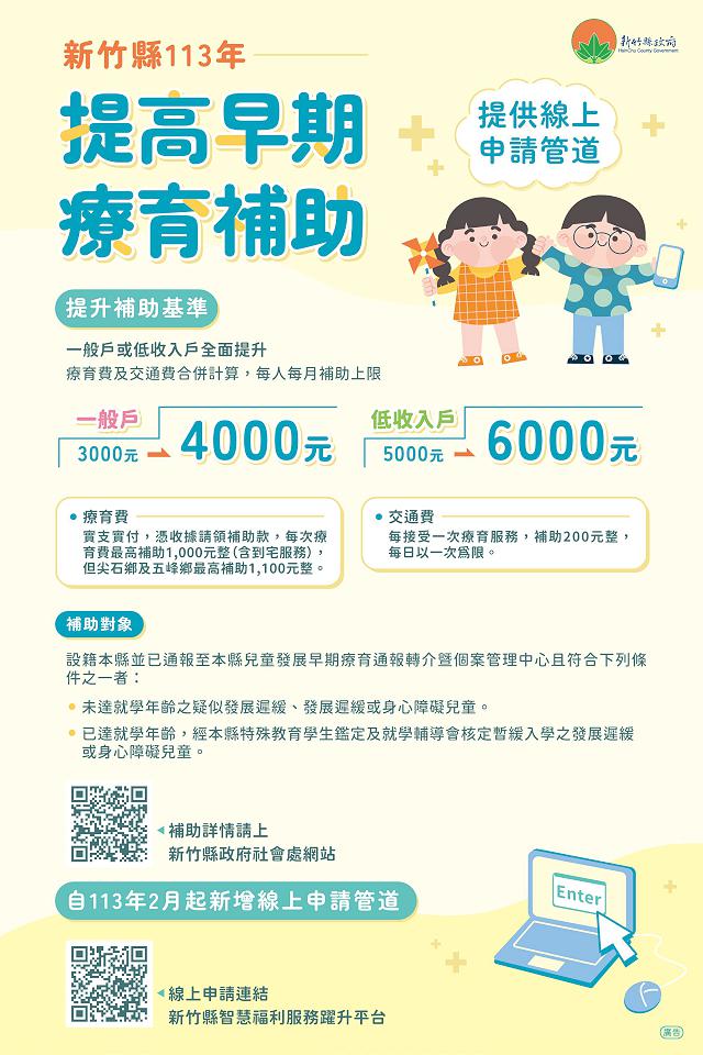 新竹縣政府重視早期療育兒童及家庭權益,積極整合社福、教育及醫療資源,為減輕早療家庭的負擔,新竹縣政府自今(113)年起提高交通費與療育費補助上限,分為一般戶及低收入戶最高補助4000元及6000元,並增加線上申請管道,民眾申請更便利,縣府盡力提供協助與支持,期望讓「慢飛天使」安心成長。