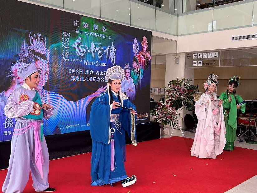 文化部「庄頭劇場 藝日限定」文化平權巡演活動,明華園戲劇總團回到故鄉,將於6月8日晚間7點在屏東縣六堆紀念公園,帶來經典代表作《超炫白蛇傳》。昨日由縣長周春米、文化部藝術發展司司長周雅菁、以及明華園團長陳勝福、當家台柱孫翠鳳率領團員,於屏東藝術館共同為《超炫白蛇傳》戶外免費演出宣傳,周縣長邀請屏東鄉親踴躍前往欣賞。