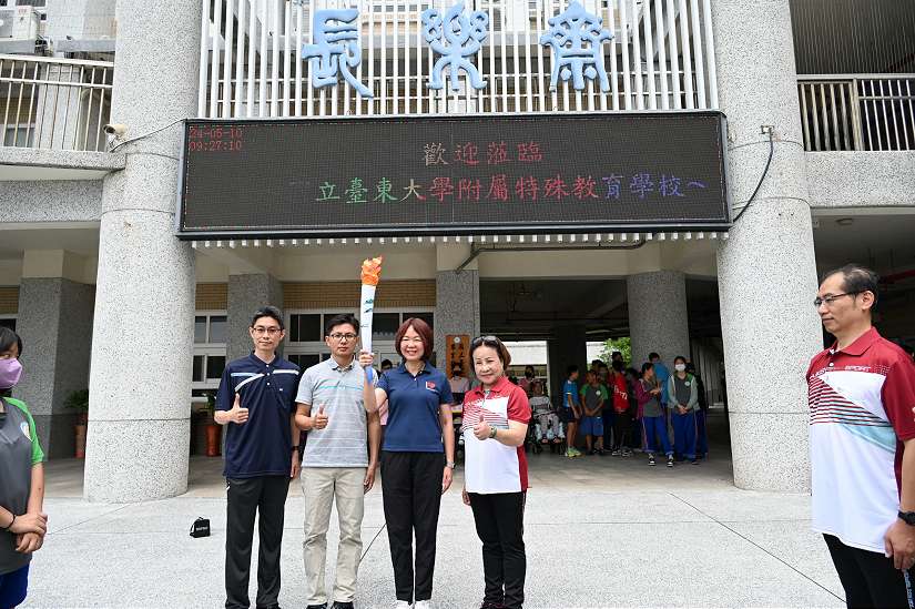 教育處蔡美瑤處長代表縣長饒慶鈴歡迎全障運聖火傳抵臺東,慰勉大會聖火組辛勞,期許參與全障運選手運動精神傳承如聖火般綿延不斷,希望臺東代表隊比賽成績亮麗,打破以往成績。