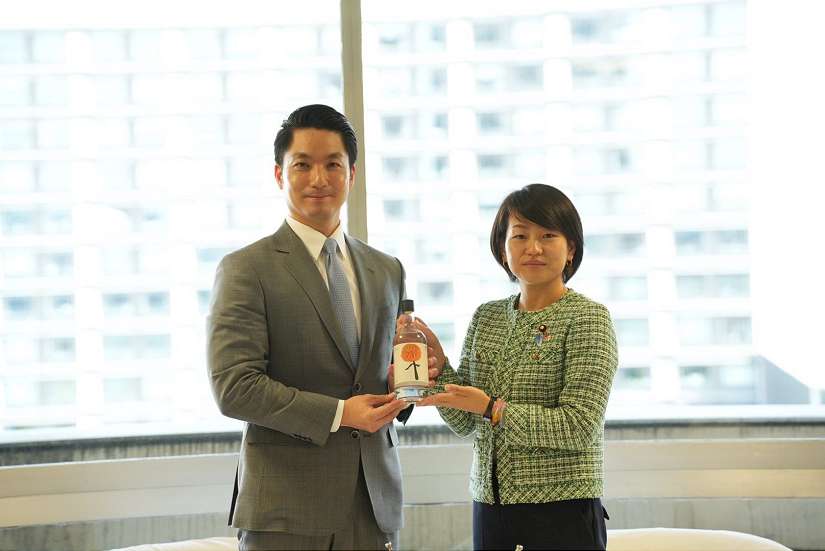 臺北市長蔣萬安一行人15日抵達日本後,第一站前往自民黨黨部拜訪自民黨青年局。拜會的一開始,他特別致贈木柵鐵觀音茶葉製作的萬壽菊茶酒與代表北市城市意象的101餅乾禮盒,謝謝鈴木貴子局長在臺北時就邀請到東京時來青年局一聚,也期盼兩市交流長長久久。鈴木貴子回贈蔣市長北海道故鄉的千歳鶴酒和白鶴造型的和菓子做為回禮,並表示鶴是和平跟長壽的象徵,也祝願蔣市長喝了就能長壽、雙方情誼長存。
