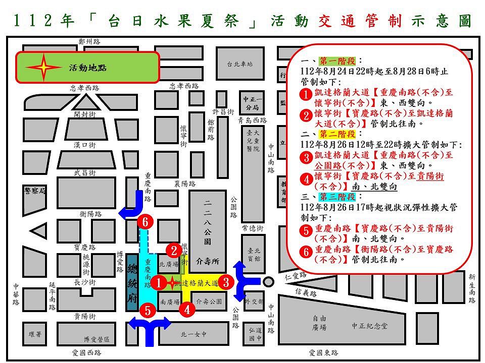 第一階段管制時段:8月24日(週四)22時起至8月28日(週一)6時止,凱達格蘭大道(重慶南路至懷寧街東、西雙向。懷寧街(寶慶路至凱達格蘭大道)管制北往南。