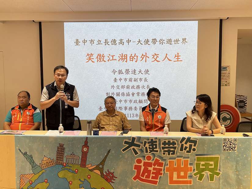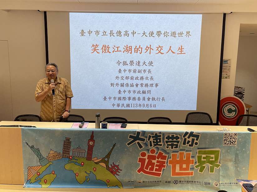 台中市政府教育局為推廣國際教育,自109年邀請退休大使到台中市各公私立高中職學校舉辦「大使帶你遊世界」講座,至今已超過2萬名學生受惠;教育局指出,今年預計辦理20場講座,第一場於(6)日在長億高中舉辦,邀請前副市長令狐榮達跟同學們分享他的「笑傲江湖的外交人生」。