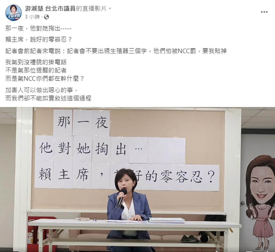 台北市議員游淑慧驚爆神腦董座鄭宏輝性騷經過。翻攝游淑慧台北市議員臉書