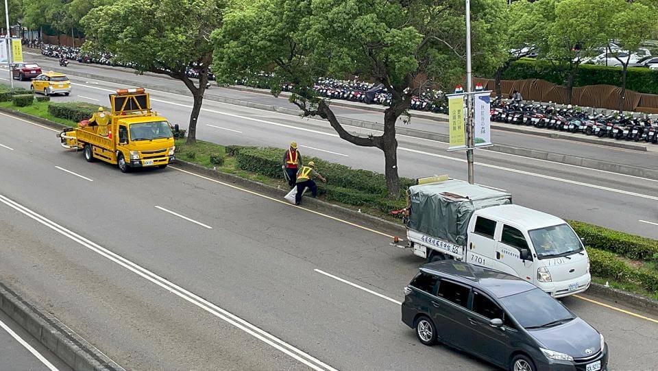 緩衝工程車讓清潔隊員能在安全環境中工作。翻攝台中市政府