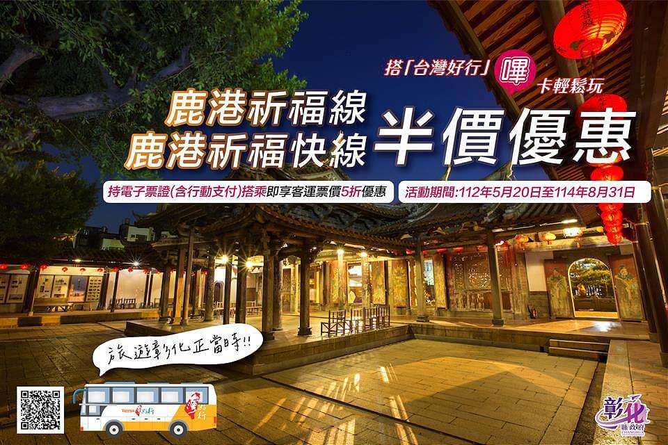 為鼓勵遊客搭乘台灣好行等大眾運輸工具暢遊彰化,彰化縣目前營運的台灣好行-鹿港祈福線,即日起至2025年8月31日止,不分平假日,可使用QR Code乘車碼支付,包括一卡通、悠遊卡、iCash等,或以行動支付一卡通MONEY、悠遊付、icash Pay等即享半價優惠!