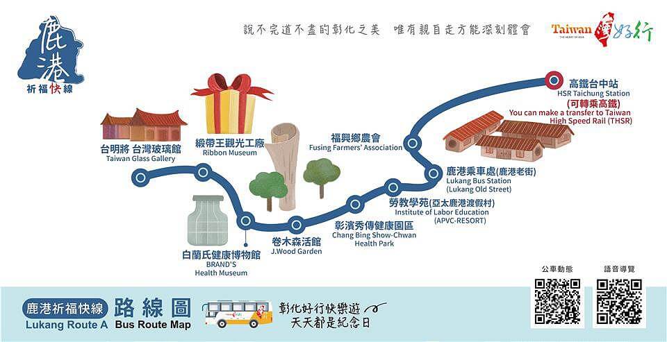 目前營運的台灣好行-鹿港祈福線(含快線)深受遊客喜愛,充滿歷史藝文氣息的鹿港老街是絕對不能錯過的景點,到鹿港感受往昔「千帆入港」的繁榮景象,漫步走在古樸的紅磚巷中,品味穿越時空的寧靜。彰濱的觀光工廠不論是知名的白蘭氏健康博物館,或別具趣味的緞帶王觀光工廠,還是晶瑩剔透的台灣玻璃館,都令遊客留下難以忘懷的體驗。
