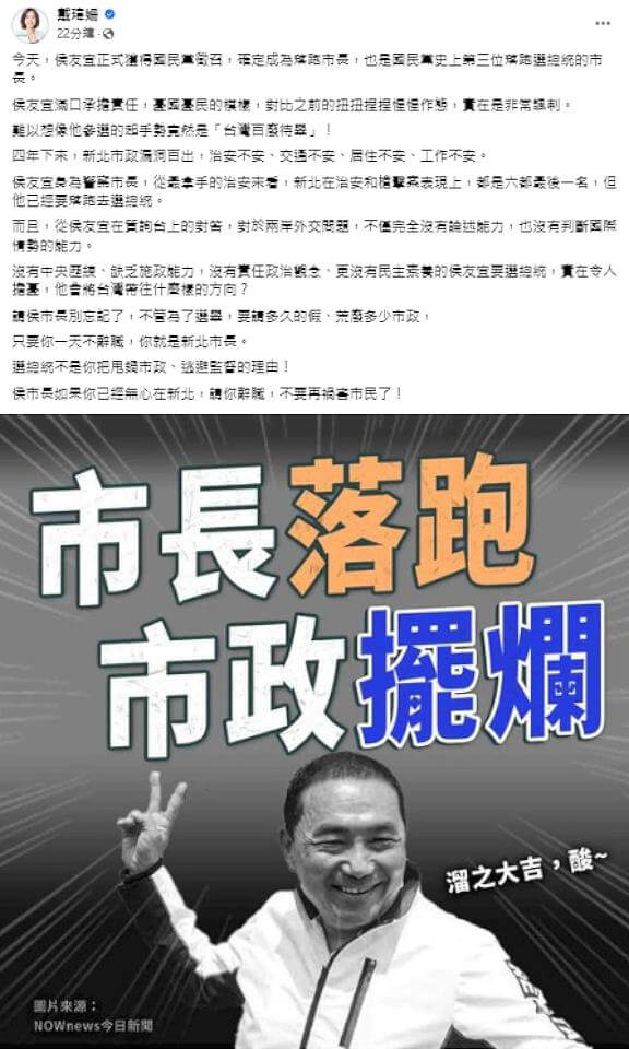 議員戴瑋姍在臉書粉絲頁中,貼出一張「市長落跑、市政擺爛」圖文,指出市長侯友宜確定成為落跑市長,更是國民黨史上第三位落跑選總統的市長,有朱立倫、韓國瑜到現在的侯友宜,她認為侯友宜沒有中央歷練、缺乏施政能力,沒有責任政治觀念、更沒有民主素養,他會將台灣帶往什麼樣的方向?四年下來,新北市政漏洞百出,治安不安、交通不安、居住不安、工作不安;選總統不是你甩鍋市政、逃避監督的理由!