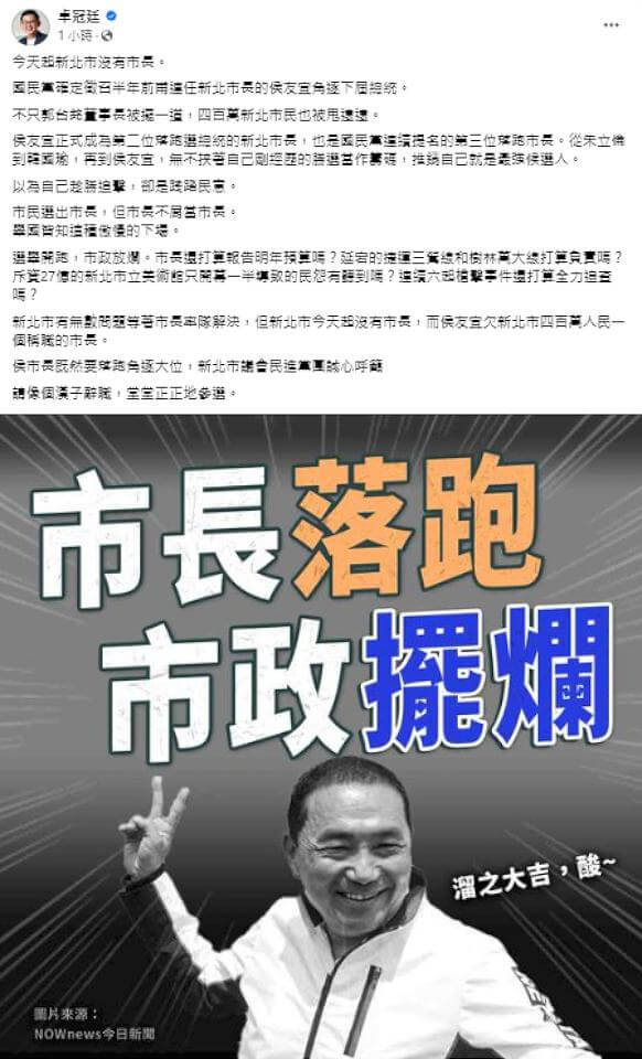 議員卓冠廷也是在第一時間就在臉書粉絲頁貼文,第一句話就是「今天起新北市沒有市長。」侯友宜是新北市第二位落跑選總統,從朱立倫再到侯友宜,都是挟著自己剛經歷的勝選當作籌碼,推銷自己就是最強候選人,然後將民意踐踏在腳下。卓冠廷還表示,國民黨2024總統大位徵召侯友宜,不僅是把鴻海創辦人郭台銘擺了一道,更是將4百萬新北市民甩遠遠的,許多市政、治安已經導致民怨,侯友宜欠新北市民一個稱職的市長。(記者余珩維/新北報導)