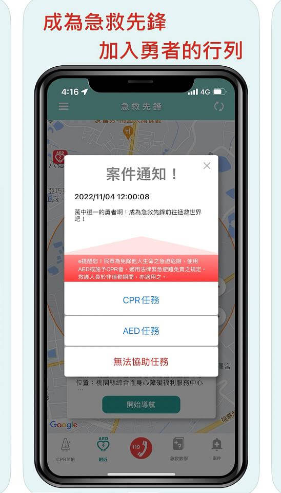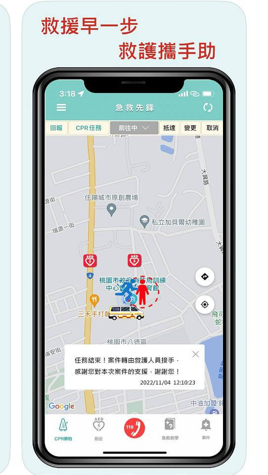 消防單位受理OHCA案件並派遣救護車的同時,找到OHCA患者周邊一定範圍內的急救先鋒,而非推播給全部的急救先鋒,急救先鋒可於接受任務後獲知OHCA患者位置,並由App引導至患者處施行CPR或引導取得AED協助患者,當然急救先鋒App並不會紀錄及保留位置及路徑等資訊,只會在推播案件時搜尋周邊的急救先鋒,希望有志者能加入協助救人。(記者余珩維/台北報導)