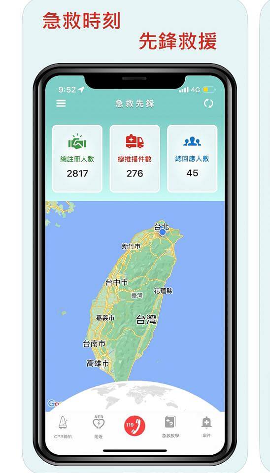 根據衛生福利部統計,台灣每年約有2萬人因「心因性因素」造成心肺功能停止(OHCA),因在醫院外心臟停止是十分緊急的狀況,所以能在1鐘內及時給予病人CPR,急救成功率可高達90%,存活率更可提高近2.5倍,所以需要民眾在救護車到達前伸出援手,因此消防署特地推出「急救先鋒」App,號召全國民眾成為急救先鋒。