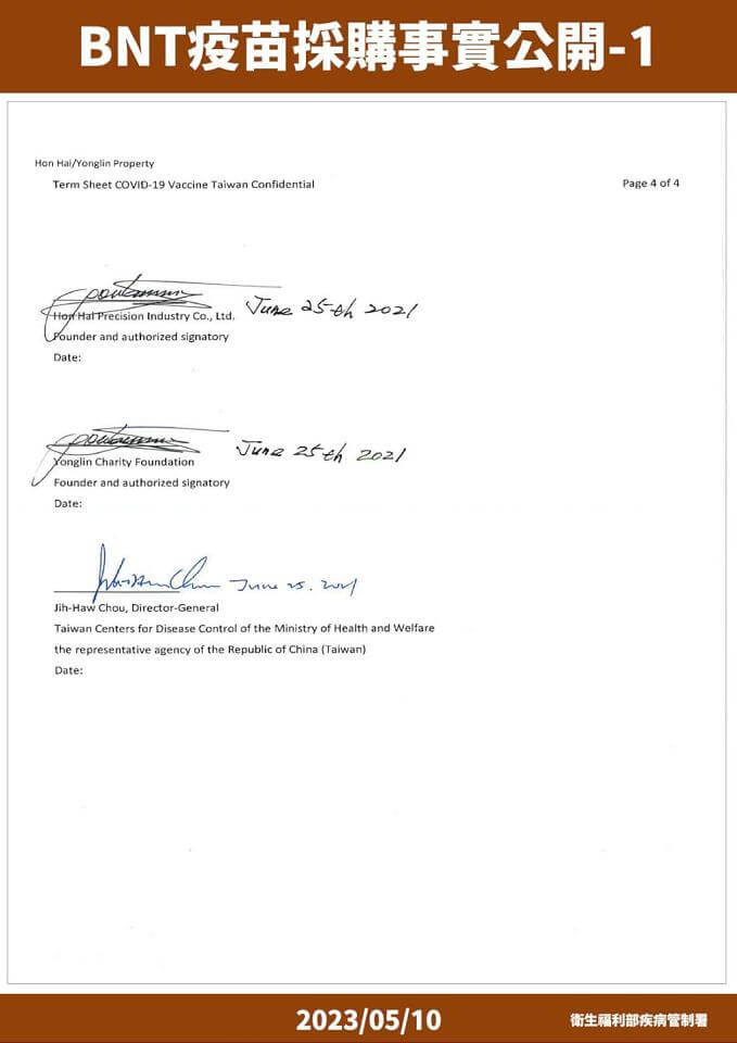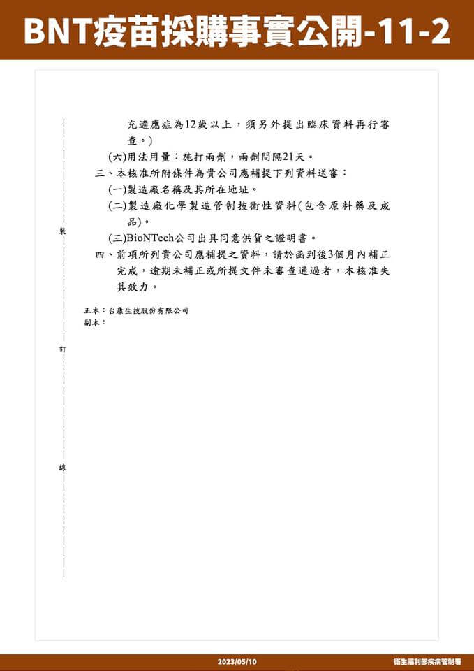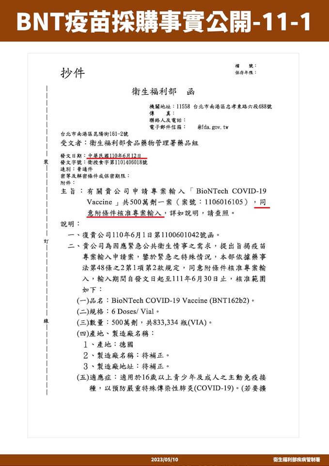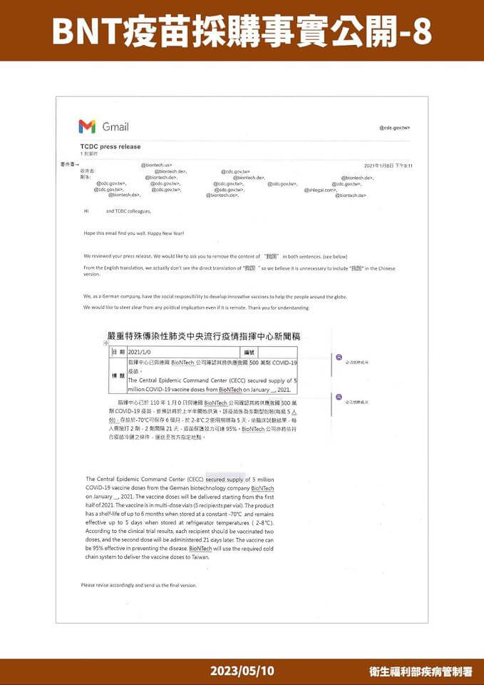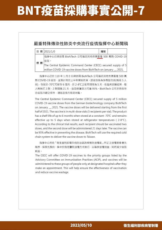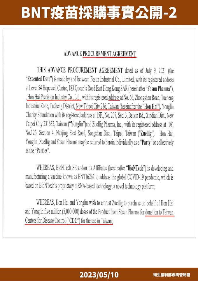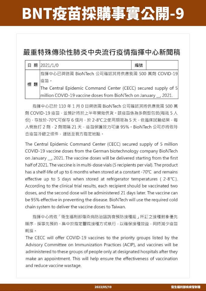衛福部疾管署以不違反保密協議下,公布BNT採購內容。翻攝衛福部疾管署