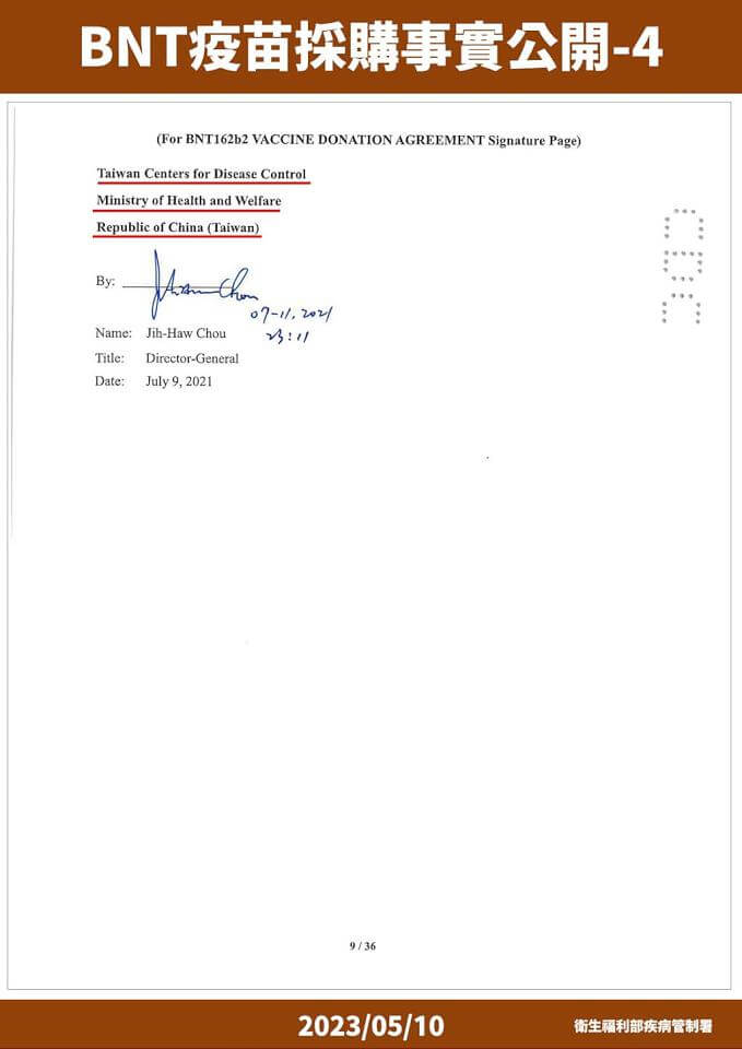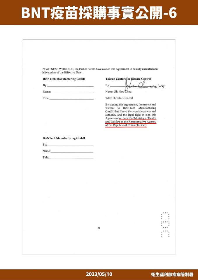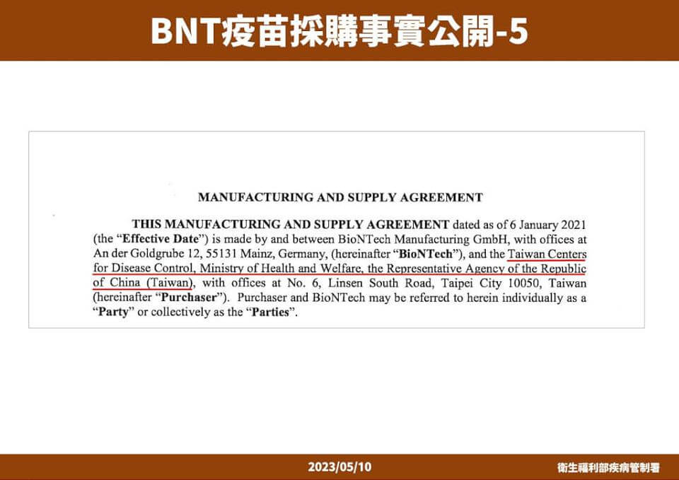 當時擔任疾管署長的衛福部次長周志浩表示,BNT疫苗在2020年8月20日就洽談,除了政府之外還有代理廠商提出購買 ,直到2020年12月31日BNT藥廠提供最終版本合約內容,經雙方檢視後確認,不料在2021年1月8日因「保密協定」成功採購新聞稿中,BNT藥廠要求將「我國」兩字調整改為「台灣」,衛福部也表示同意後,卻在2021年1月15日BNT藥廠要求重新評估疫苗量、調整供給時程,合約就是這樣延誤從此沒有接到回信。