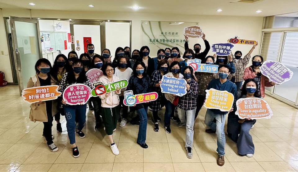 新北市家防中心穿牛仔褲上班以響應支持「國際丹寧日」。翻攝新北市政府