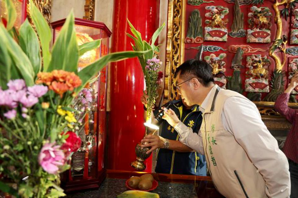 市長黃偉哲巡檢神桌上供神的花瓶及馬草水等易積水之處。翻攝台南市政府