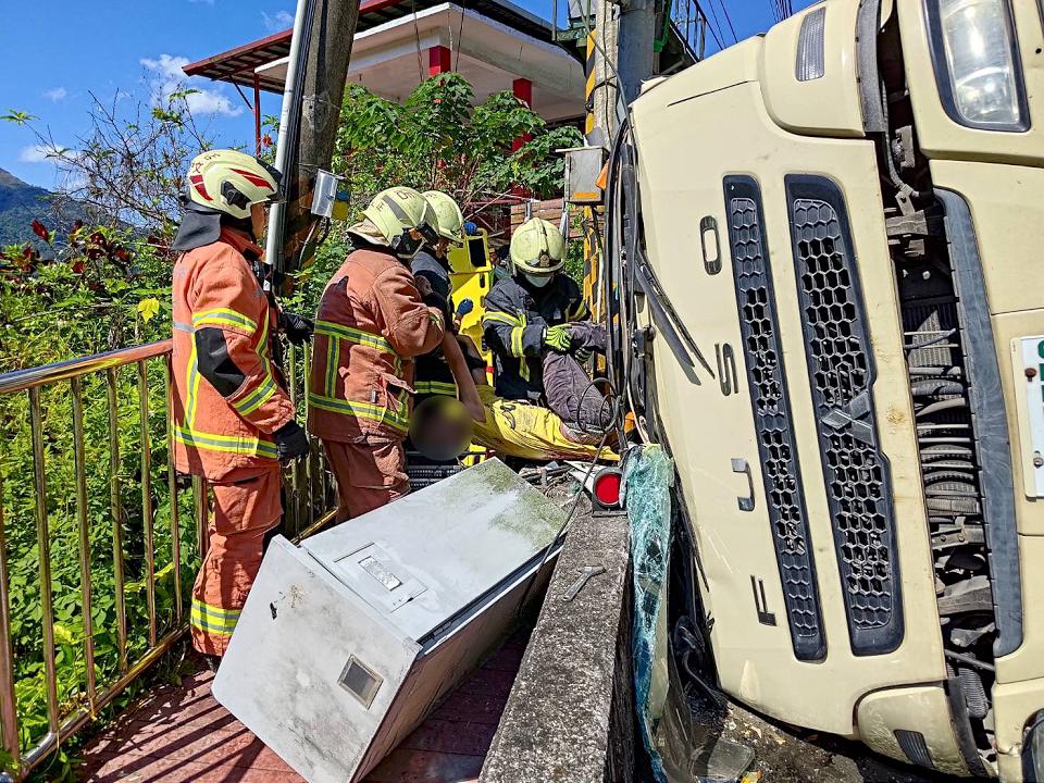 警消獲報抵達現場,利用破壞器材將受困的游姓駕駛救出,但人已經沒有呼吸心跳,緊急將人送往醫院搶救。警方已針對翻車進行交通疏導,進行單向管制通行,並聯絡大型吊車協助,將預拌混泥車扶正拖離現場。(記者余珩維/新北報導)