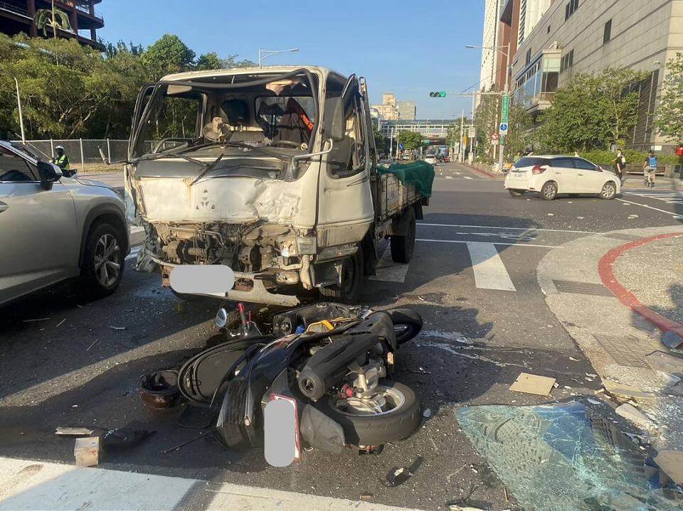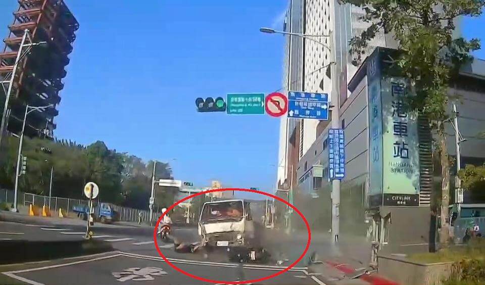 當時黃姓騎士(19歲)緊跟在貨車後方,因為看見貨車急煞打滑,同樣急煞後直接滑倒摔車,剛好與180度轉向的貨車正面撞擊,整個人在路上翻滾,差點成了貨車輪下亡魂。警方到場後,2人都沒有酒駕,柯姓駕駛臉部撕裂傷、腳部擦傷,黃姓騎士手腳部多處擦傷,相關肇事責任還有釐清。(記者黃子瑋/台北報導)