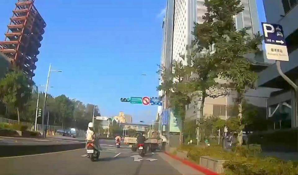 根據行車紀錄器畫面,當時貨車從內線車道超車,來到事發地點時,因沒注意前方機車減速,貨車柯姓駕駛(50歲)情急猛踩剎車,整輛貨車後輪打滑,往路邊號誌燈桿衝撞,車頭當場全毀,車輛還180度迴轉後才停下。