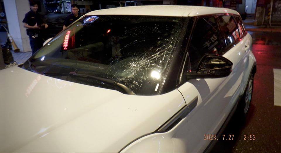 陳女酒駕追撞機車,擋風玻璃破成蜘蛛網狀。畫面讀者提供