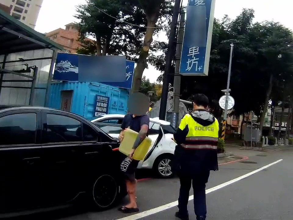 許嫌抽租賃車汽油後,加入自己的轎車內,遭警方上前盤查。讀者提供