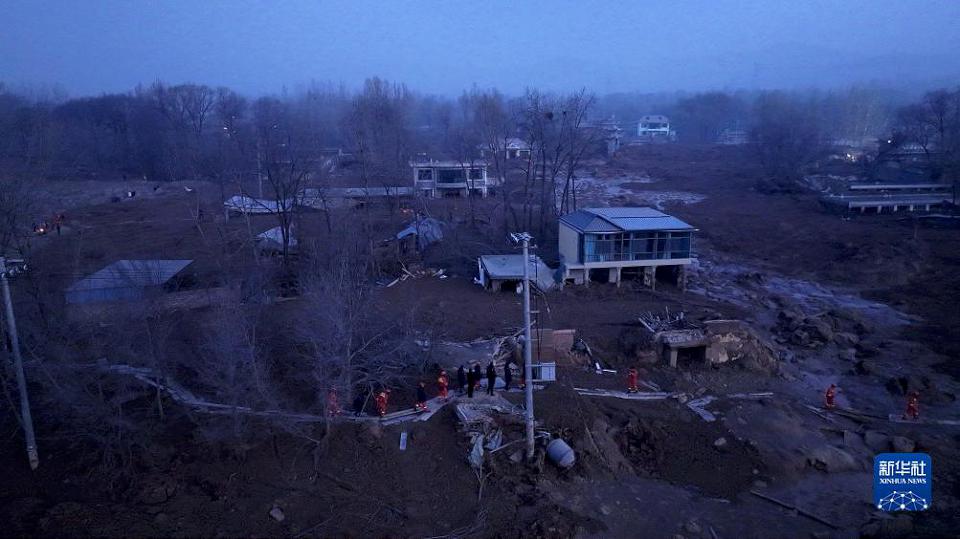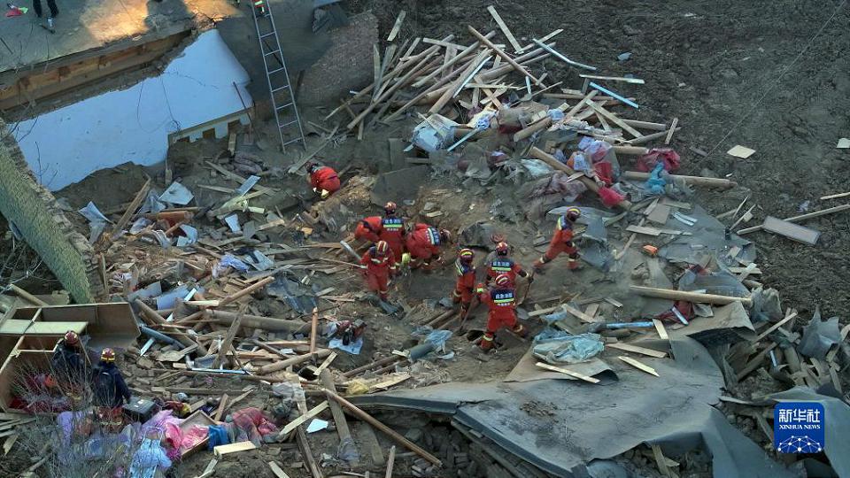 強震後房屋倒塌,救難人員全力搶救。翻攝新華網