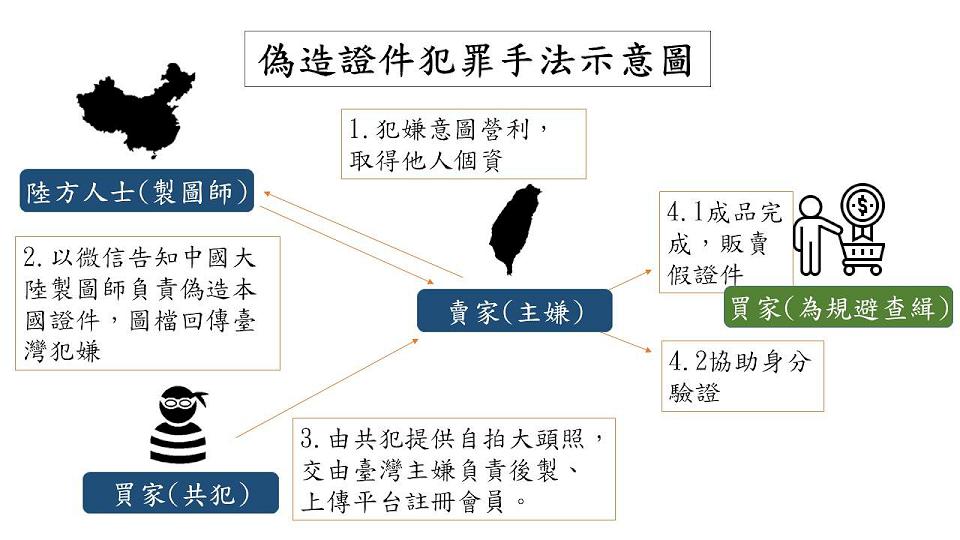 警方調查,偽造證件犯罪集團何姓主嫌,在臉書、Telegram等軟體中,散佈販售偽造證件的訊息,當有買家下訂後,就會將欲偽造身分證上的資訊,以通訊軟體WeChat傳至位於對岸的共犯,隨後將偽造完成的樣本,再次傳給台灣的集團成員,進行最後的裁切、護貝等作業。