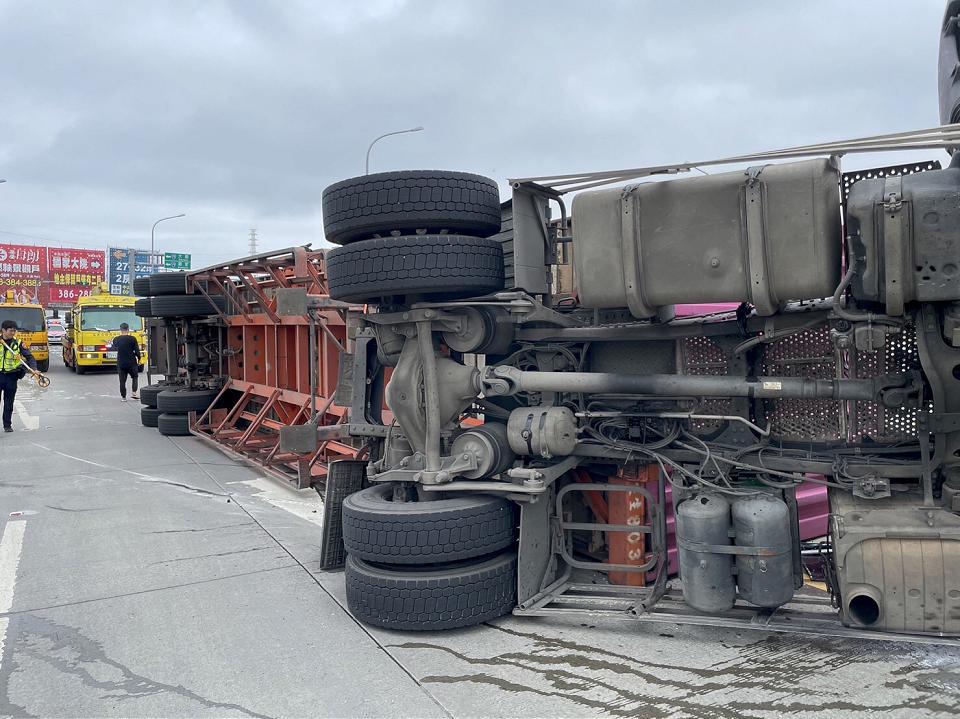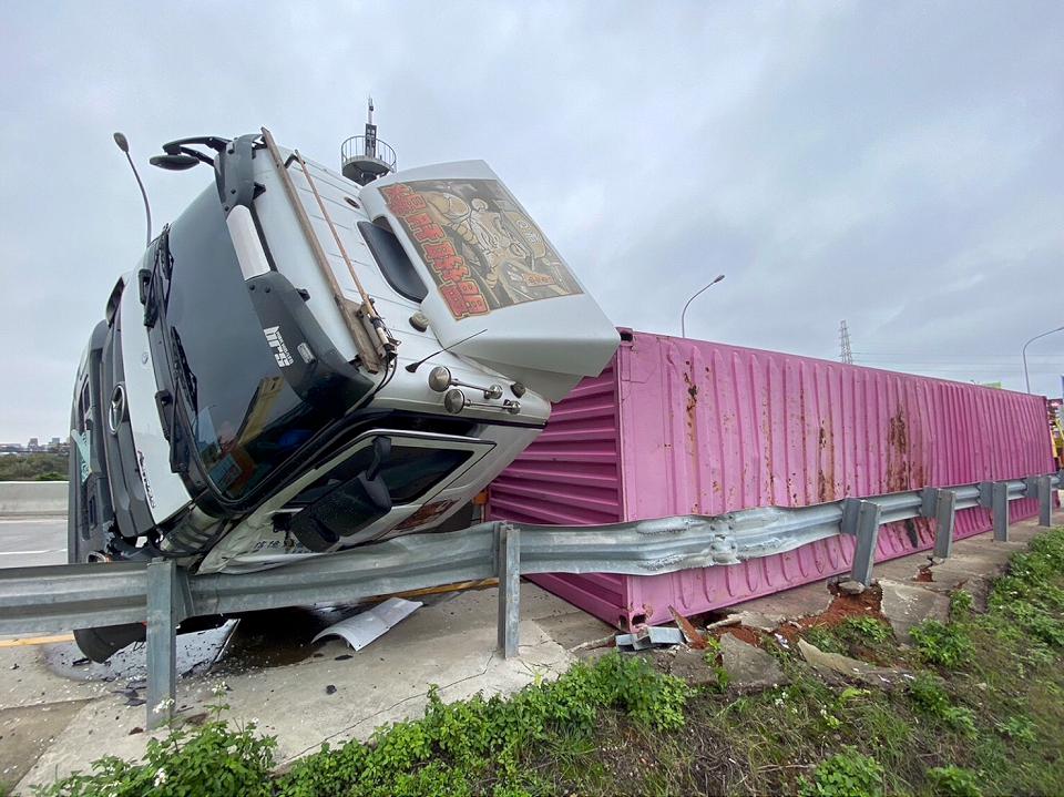國2甲線0公里貨櫃車翻覆 駕駛受困救出無大礙