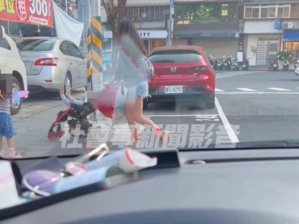 女子忿忿然推著嬰兒車離開車位。翻攝社會事新聞影音
