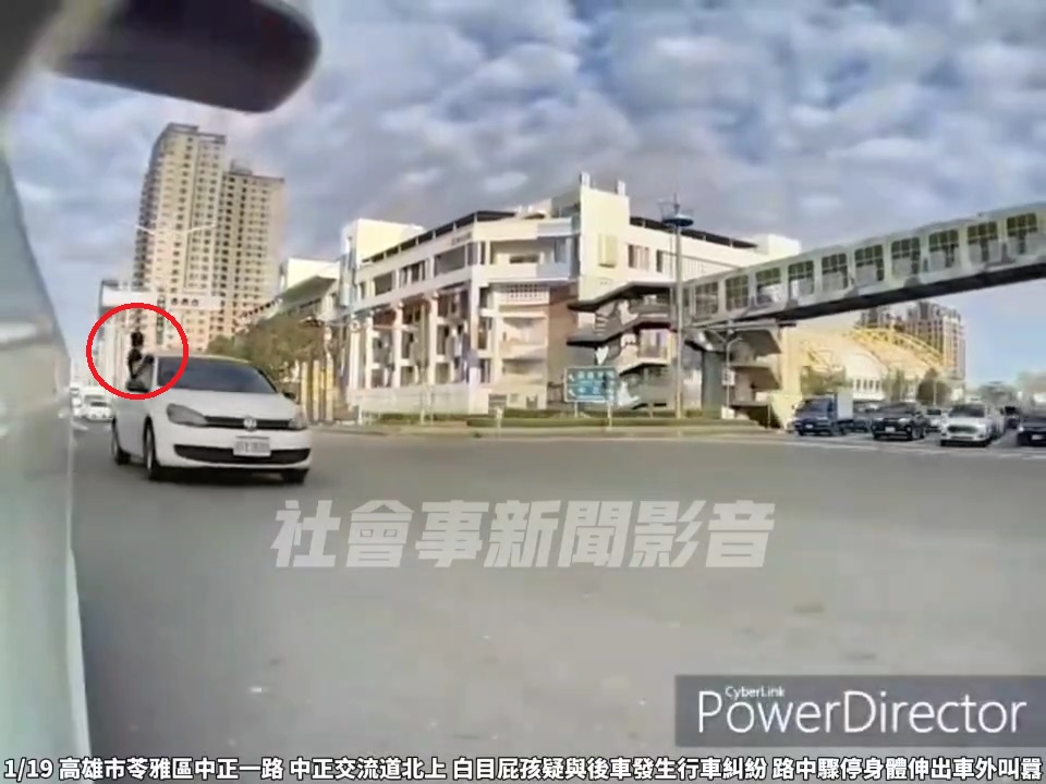 警方根據行車紀錄器畫面初步調查,事發在19日上午8時許,這輛白色轎車沿著中正一路要左轉上交流道,行經高速公路下方時,疑似與後方的車輛發生行車糾紛,先是後座男子從車窗探出上半身叫囂,隨後整輛車突然驟停在左轉車道上,後座男子打開車門站在門框上繼續叫囂,同時副駕駛座男子下車助陣,隨後2人回到車上,駕駛加足油門離去。