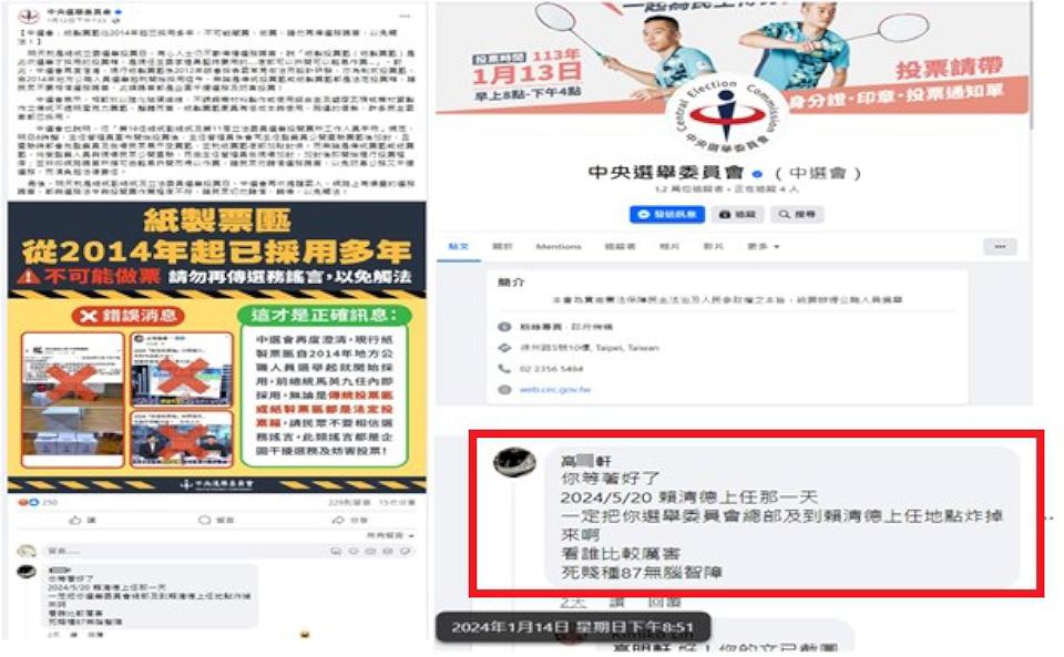 警方調查,中選會臉書粉專於1月13日選舉結果揭曉當天晚間,遭臉書帳號「高○軒」貼文「等著好了 2024/5/20賴清德上任那一天 一定把你選舉委員會總部及到賴清德上任地點炸掉 來啊 看誰比較厲害 死賤種87無腦智障」。高調挑釁的言論立即遭到刑事警察局科技犯罪防制中心科技偵查隊鎖定。